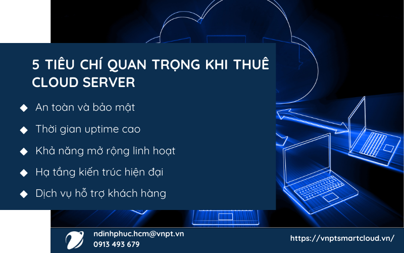 Tìm hiểu 5 tiêu chí quan trọng khi thuê cloud server, bao gồm bảo mật toàn diện, thời gian uptime cao, khả năng mở rộng linh hoạt, hạ tầng hiện đại và dịch vụ hỗ trợ khách hàng chuyên nghiệp.